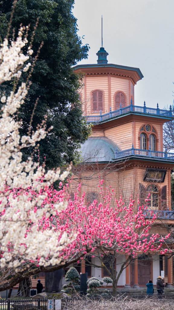 プラムガーデンから山形市郷土館を背景に撮影すると、梅と歴史ある建物を一緒に収めた印象的な写真に仕上がります。